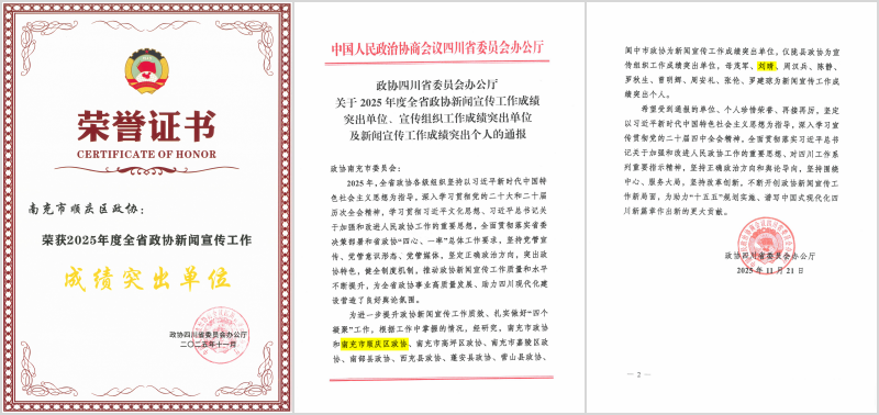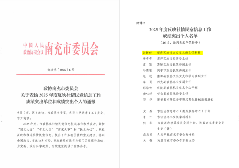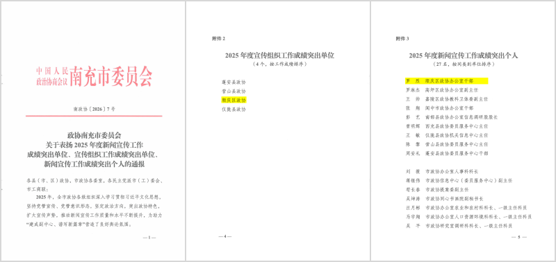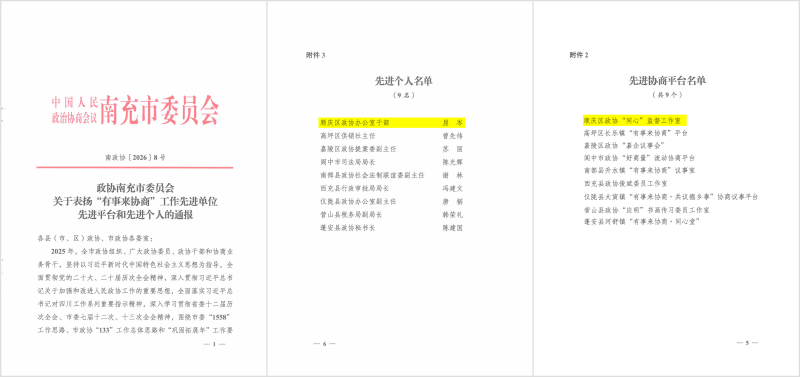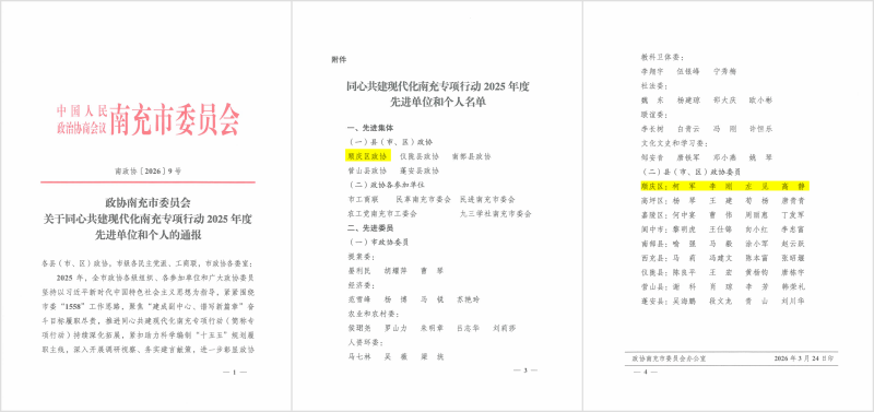 区政协和1名委员被省政协表扬为同心共建现代化四川专项行动先进单位和先进个人,区政协和4名委员被市政协表扬为同心共建现代化南充专项行动2025年度先进单位和先进委员。区政协“同心”监督工作室和1名机关干部被市政协表扬为“有事来协商”工作先进协商平台和先进个人。2名机关干部被市政协表扬为“学习新思想、践行新使命、奋进新征程”主题读书与实践活动2025年度先进个人。