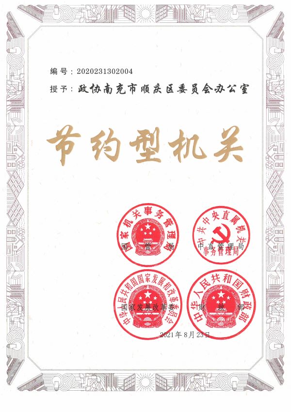近日,顺庆区政协机关被国家机关事务管理局、中共中央直属机关事务管理局、中华人民共和国国家发展和改革委员会、中华人民共和国财政部联合表彰为“节约型机关”,系首次获得国家级荣誉称号。