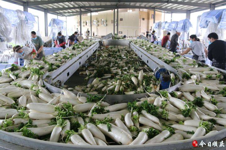 ▲渔溪镇蔬菜基地正在清洗萝卜装车