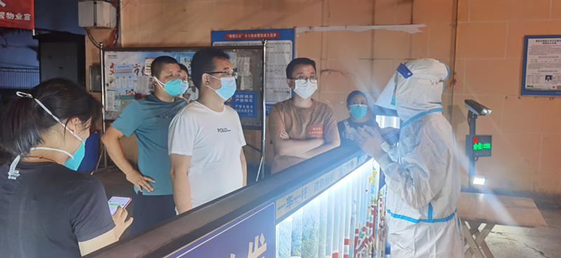 东南街道文昌巷锦绣江山小区在8月27日全域全员核酸检测中,发现一例阳性人员,经专家诊断为无症状感染者后,随即被划定为高风险区。为进一步做好区域内疫情防控相关工作,8月28日晚上,作为该点位的联系县级领导,刘彤副主席亲自带队,在按要求做好自身防控的情况下,义无反顾地进入小区内,开展人员摸排、防控宣传、群众安抚等工作,努力把信心和温暖传递给大家。