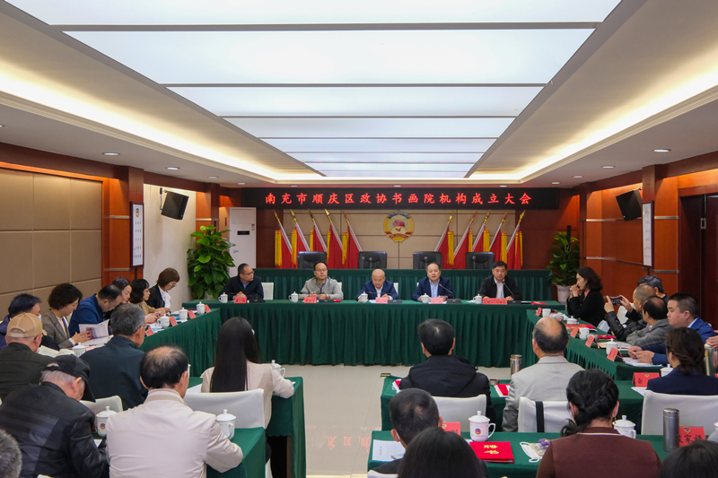 会议宣读了成立顺庆区政协书画院机构的批复和书画院院委会组成人员名单,表决通过了《南充市顺庆区政协书画院章程》,现场为书画院授印,为院委会成员、特聘顾问、四大协会代表颁发聘书,接收艺术家赠送作品并颁发永久收藏证书。