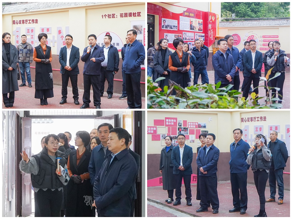 在和平路街道花园坝社区,吴斌一行参观了各民主党派与中国共产党团结同心文化墙,了解了同心议事厅的工作内容,听取了相关负责人对“同心苑里话同心”这一特色履职模式的工作情况汇报。他指出,和平路街道花园坝社区充分利用室外空间,按照融合、嵌入、共享、开放的理念,打造了多位一体的委员履职服务新平台,兼具宣讲宣传、协商议政、学习提能等多种功能,在老旧小区多、群众数量多的社区营造出了浓厚的协商氛围,彰显出了更多的政协气息,增强了群众对政协协商平台建设的认知度。他要求,和平路街道政协委员联络组要注重室外文化墙的管护,要进一步丰富“同心议事厅”工作载体,完善“同心苑里话同心”这一特色履职模式的工作内容,让委员和群众的互动程度在同心苑里不断提高,从而为实现建言资政和凝聚共识双向发力不断注入新活力。