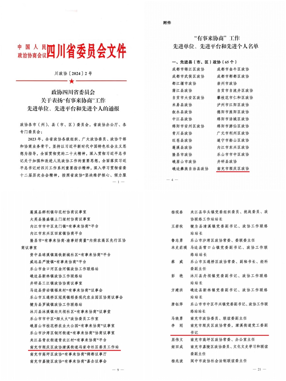 近日,省政协召开三项重点工作会,通报表扬了全省“同心共建现代化四川”专项行动、主题读书与实践活动、“有事来协商”三项重点工作先进单位和先进个人等。顺庆政协被省政协表扬为“有事来协商”工作先进县(市、区)政协,潆溪街道冯家寺社区委员工作站被省政协表扬为“有事来协商”工作先进协商平台,1名委员被省政协表扬为“有事来协商”工作先进个人,1名委员被省政协表扬为“同心共建现代化四川”专项行动2023年度先进委员,2名委员被省政协表扬为“学习新思想、践行新使命、奋进新征程”主题读书与实践活动2023年度先进个人。