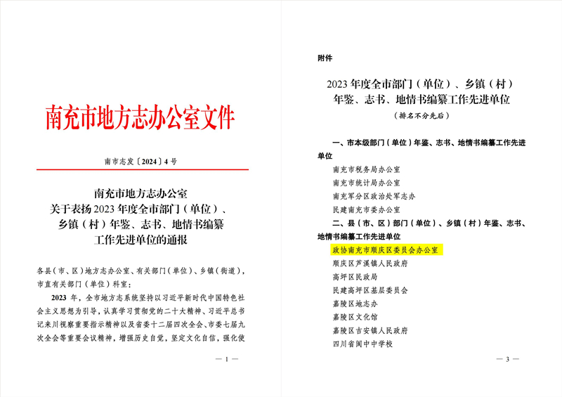 近日,市地方志办公室印发通报,区政协成功获评全市年鉴、志书、地情书编纂工作先进单位,并在各县(市、区)中排名第一。