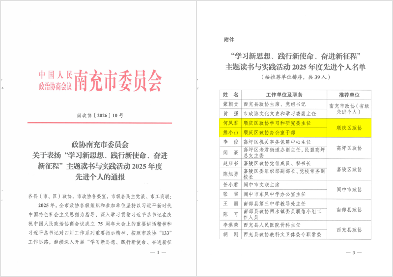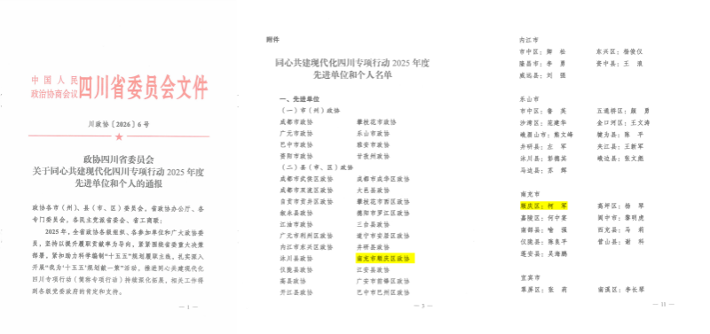 区政协和1名委员被省政协表扬为同心共建现代化四川专项行动先进单位和先进个人,区政协和4名委员被市政协表扬为同心共建现代化南充专项行动2025年度先进单位和先进委员。区政协“同心”监督工作室和1名机关干部被市政协表扬为“有事来协商”工作先进协商平台和先进个人。2名机关干部被市政协表扬为“学习新思想、践行新使命、奋进新征程”主题读书与实践活动2025年度先进个人。