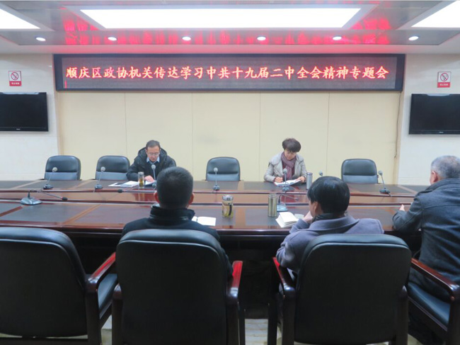 1月26日,顺庆区政协召开干部职工大会,专题传达学习中共十九届二中全会精神。区政协党组副书记、副主席张霞主持会议。