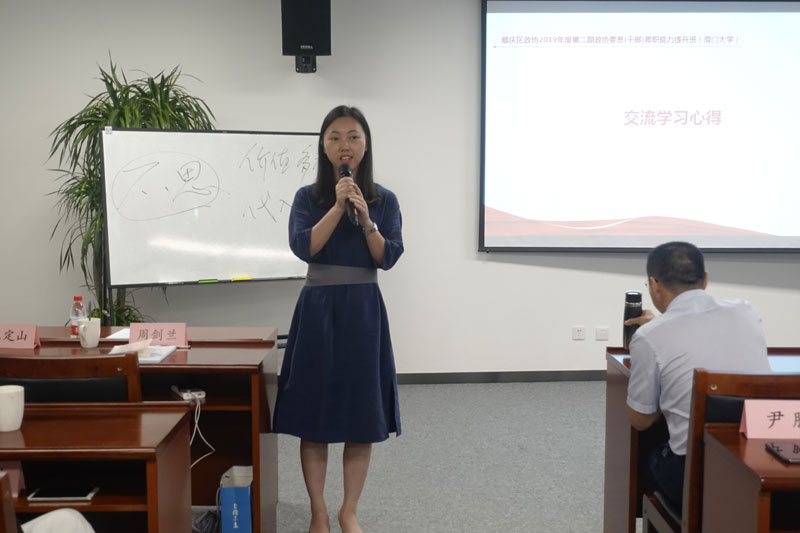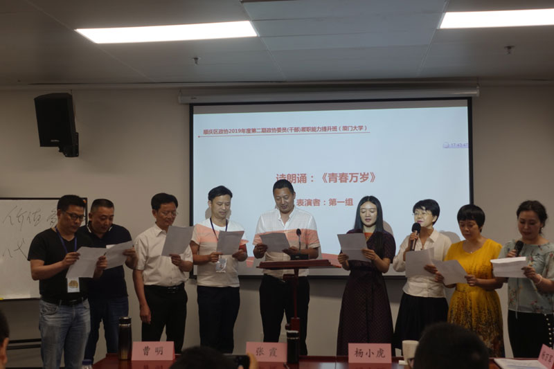 5月17日下午上课结束后,区政协2019年度第二期政协委员(干部)履职能力提升班组织委员开展了一次学习交流研讨活动。活动中,参训学员以个人为单位分享了心得体会、谈论了学习感悟,并以小组为单位开展了文艺汇演。文艺汇演在深情的诗朗诵《青春万岁》中拉开帷幕,闽南歌曲《爱拼才会赢》、方言秀《浙江方言》、大合唱《我和我的祖国》等节目陆续上演,其中,诙谐幽默的三句半《厉害了,我的国》将活动推向了高潮,现场气氛热烈,赢得在场观众掌声不断,叫好连连。区政协副主席张霞对本次活动作了点评,她指出,本次活动节目形式多样,内容丰富多彩,让我们深深感受到这是一次有着优秀的班干部、能干的小组长、可爱的学员、快乐的学习、美好的班集体的愉快学习之旅,大家遵守培训纪律、认真学习知识、互相关心帮助、积极参与活动,充分展现了全体学员的良好精神风貌。本次培训既为大家提供一个相互学习、交流、沟通的平台,也增强了政协队伍的凝聚力和向心力,更是为各位委员积极履职打下了坚实的基础,提升了履职水平和能力。