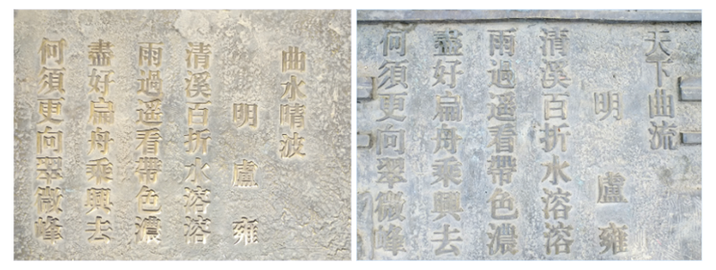 一、内容错误。广场上选用明御史卢雍诗二首,一首为《曲水晴波》,所刻内容为:“清溪百折水溶溶,雨过遥看带色浓,尽好扁舟乘兴去,何须更向翠微峰”。另一首为《天下曲流》,所刻内容与《曲水晴波》相同。经查阅《清康熙·顺庆府志》《清嘉庆·南充县志》《历代名人咏南充》《顺庆掌故》《南充掌故》等文献,未寻到《天下曲流》。因资料有限,卢雍虽曾写过南充古八景,但是否有《天下曲流》不得而知。若有,建议制作方按原文订正;若找不到原文则应另选一首诗制作,古往今来写南充美景的诗很多,不乏佳作。