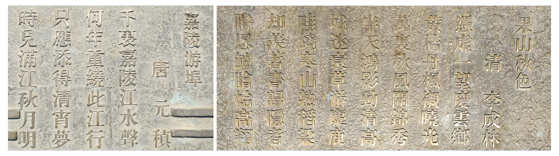 二、错别字。一是清人王以丰《连洲古谶》诗中一处“洲”误为“舟”。《清嘉庆·南充县志》载原文如下:“山川灵秀毓公侯,千载犹传大小洲。我欲携樽洲(此处不是‘舟’)上座,隔江撑过木兰舟”。将“洲上座”写成“舟上座”,完全改变了作者原意,诗中“连洲”即大小洲,俗名大中坝、小中坝,是南充段嘉陵江中的江心岛。作者原想提着酒拿着杯去江心岛上饮酒咏诗,而不是到船上去饮酒,诗的下句已有“木船从对岸撑过来了”,此处用“舟”字不符合格律诗的规则。二是唐人元稹《嘉陵游埠》中“千里”的“里”误为“裏”,原诗如下:“嘉陵千里江水声,何年重绕此江行。只应添得清宵梦,时见满江秋月明”。此处的“里”意为“里程”,是长度单位,经查《古汉语字典》《康熙字典》,古代汉语中“里”和“裏”是不同的两个字,互相不通用,只是后来简化字时把“裏”简化为“里”了。具体来讲,“裏”字有三种意思,一是衣、被的内层;二是内部、里面,内与外相对,并引以为一定范围之内,如这里、那里;三是某个时间内,如夜里、日里。故此处雕刻应用古法“里”,取长度单位“路程”意。同理,清人顺庆知府李成林所作《果山秋色》中“万里”的“裏”也应为“里”。原诗如下:“凭虚一望庆云乡,黄桔丹枫衬晓光。万里秋风开锦秀,半天鸿影动清高。城迷衰草游麋鹿,畦绕寒山熟稻梁。却羡著书归隐者,胜恩鲈脍始高翔”。