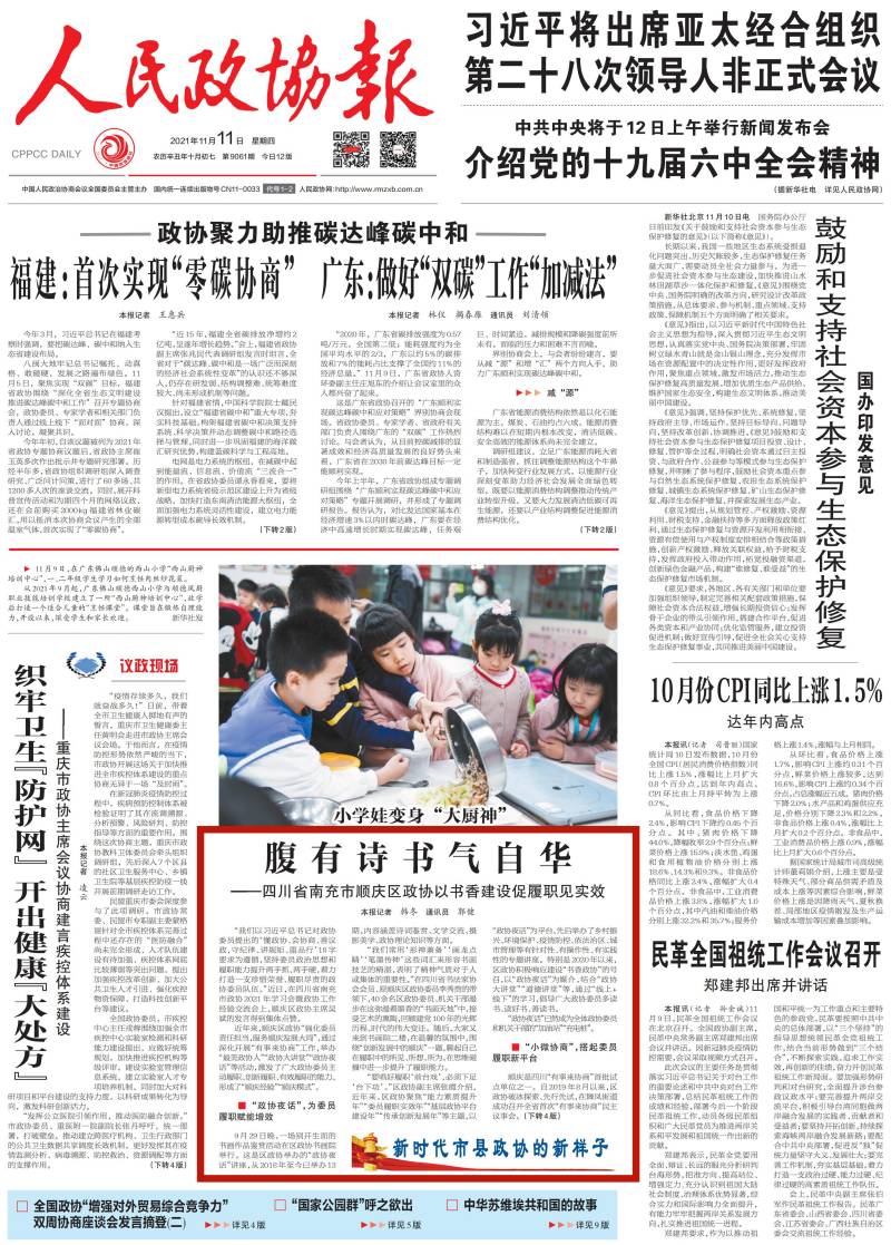 11月11日,《人民政协报》头版,以“腹有诗书气自华——四川省南充市顺庆区政协以书香建设促履职见实效”为题,刊载了区政协牢记习近平总书记对政协委员提出的“懂政协、会协商、善议政,守纪律、讲规矩、重品行”18字要求,坚持委员政治思想和履职能力提升两手抓、两手硬,着力打造一支珍惜荣誉、履职尽责的政协委员队伍的典型做法。